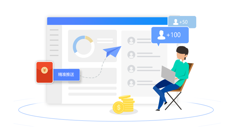 支持对海量的客户以及客户群,推送消息、甚至小程序、优惠券等,并可追踪效果。